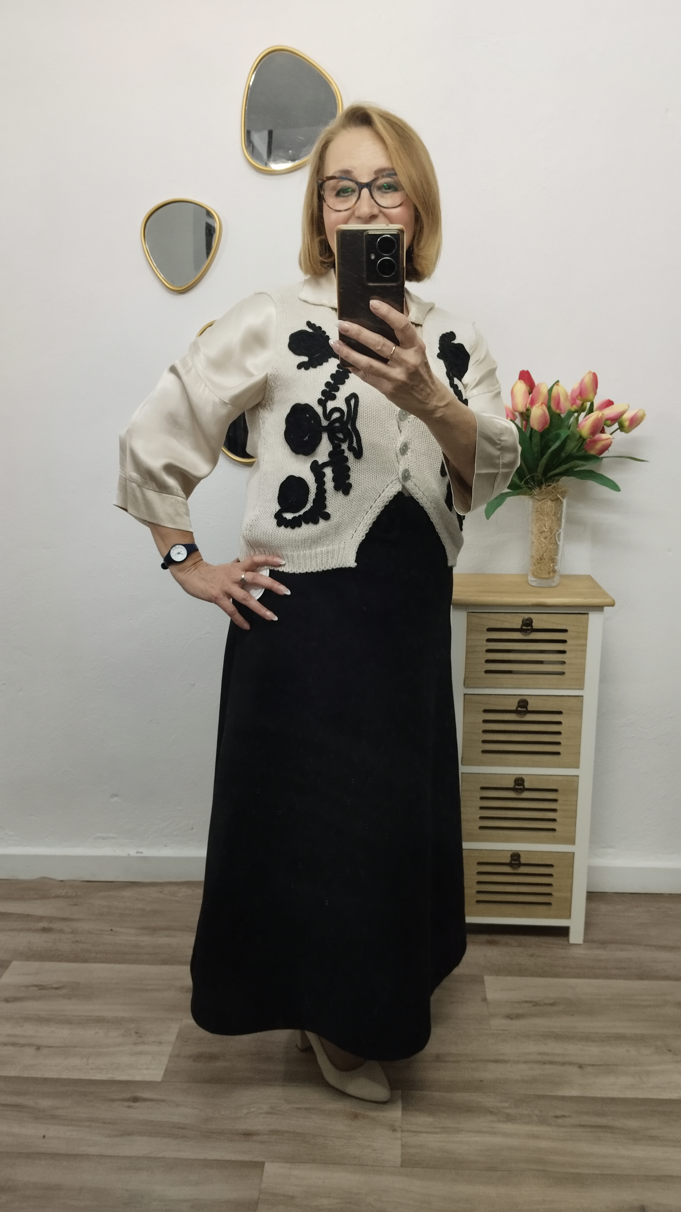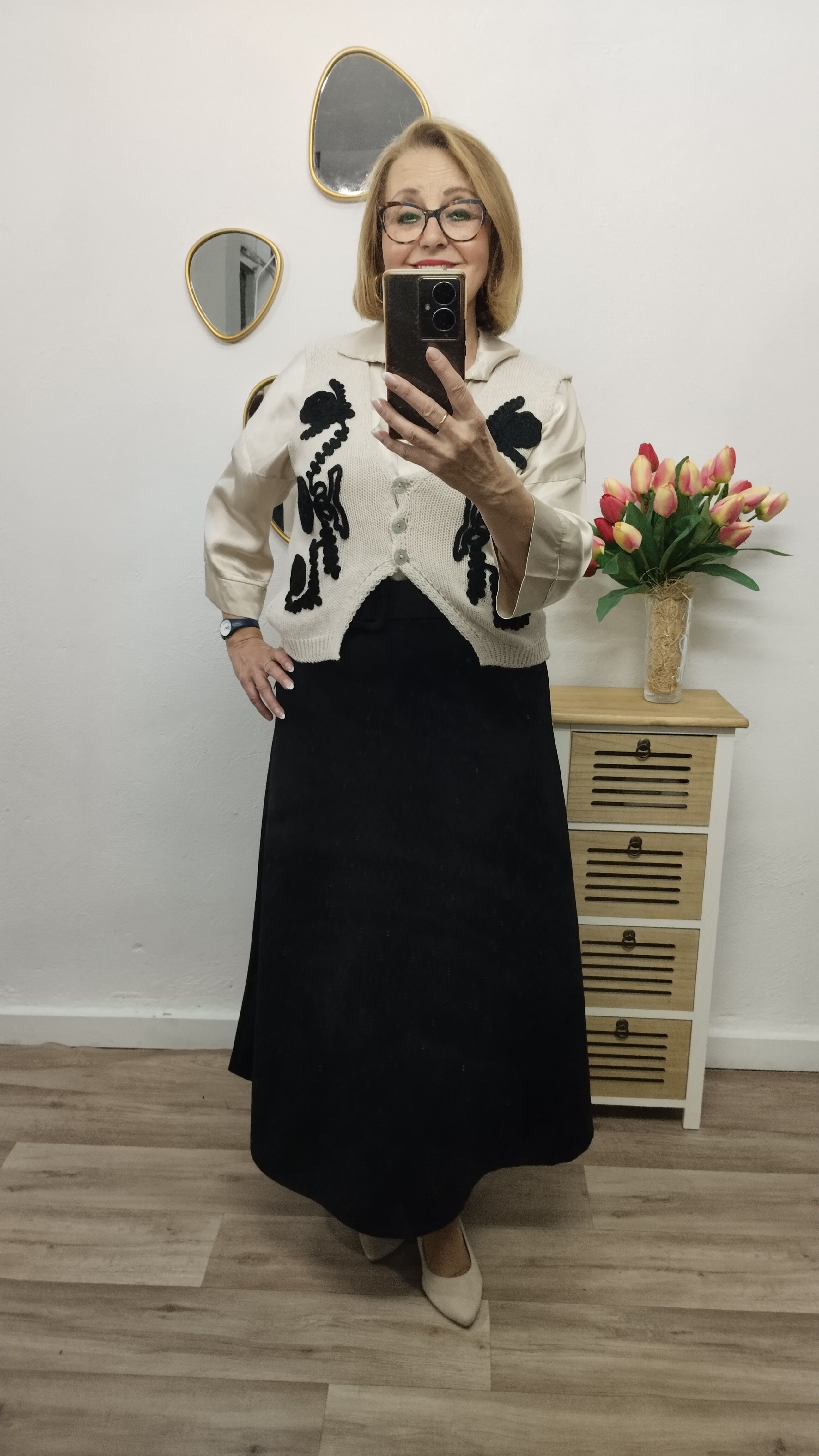 - Chaleco de lanita, caladito, cuello en pico, abrochado con tres botones, y detalle de bordados en color negro.