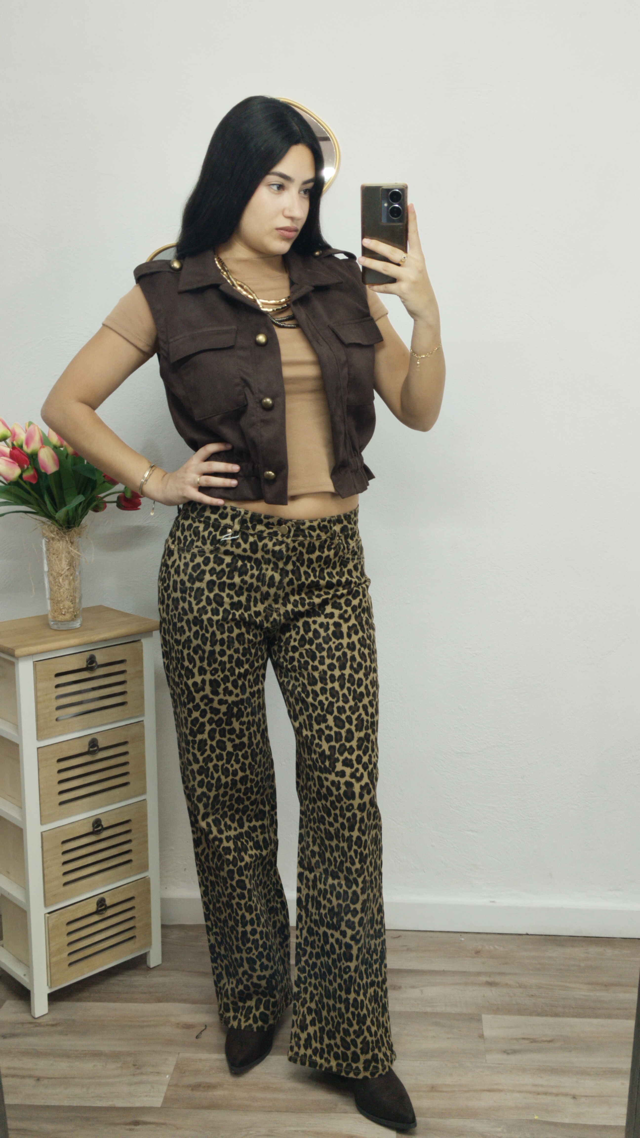 Chaleco corto de antelina, con bolsillos al pecho