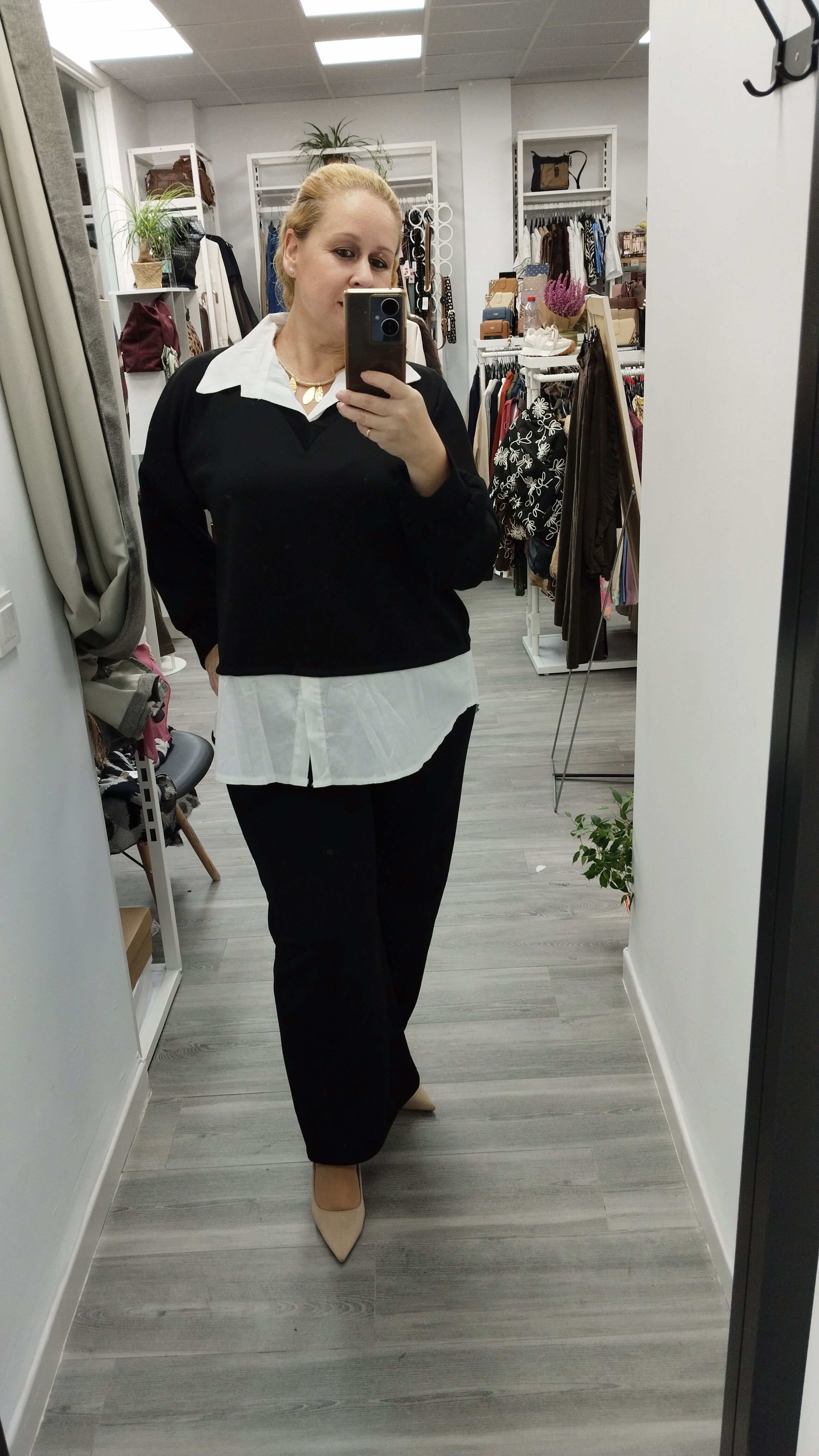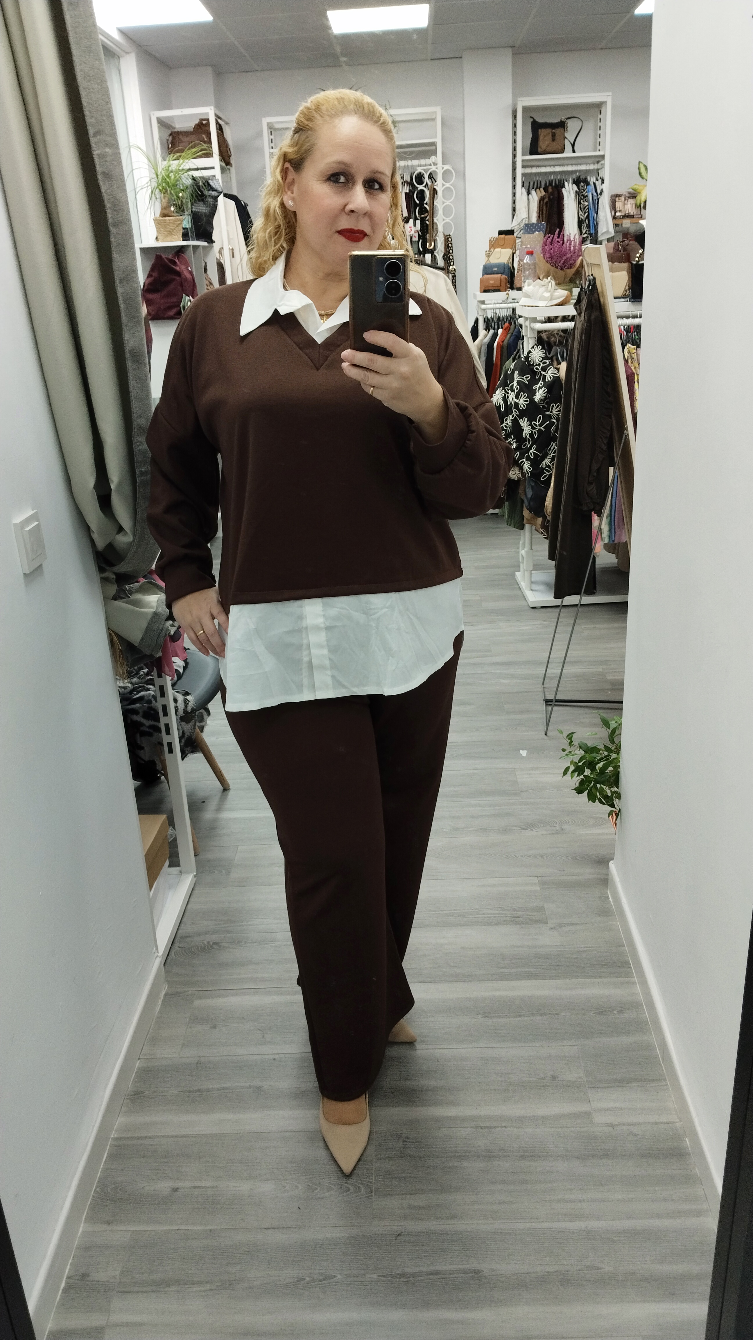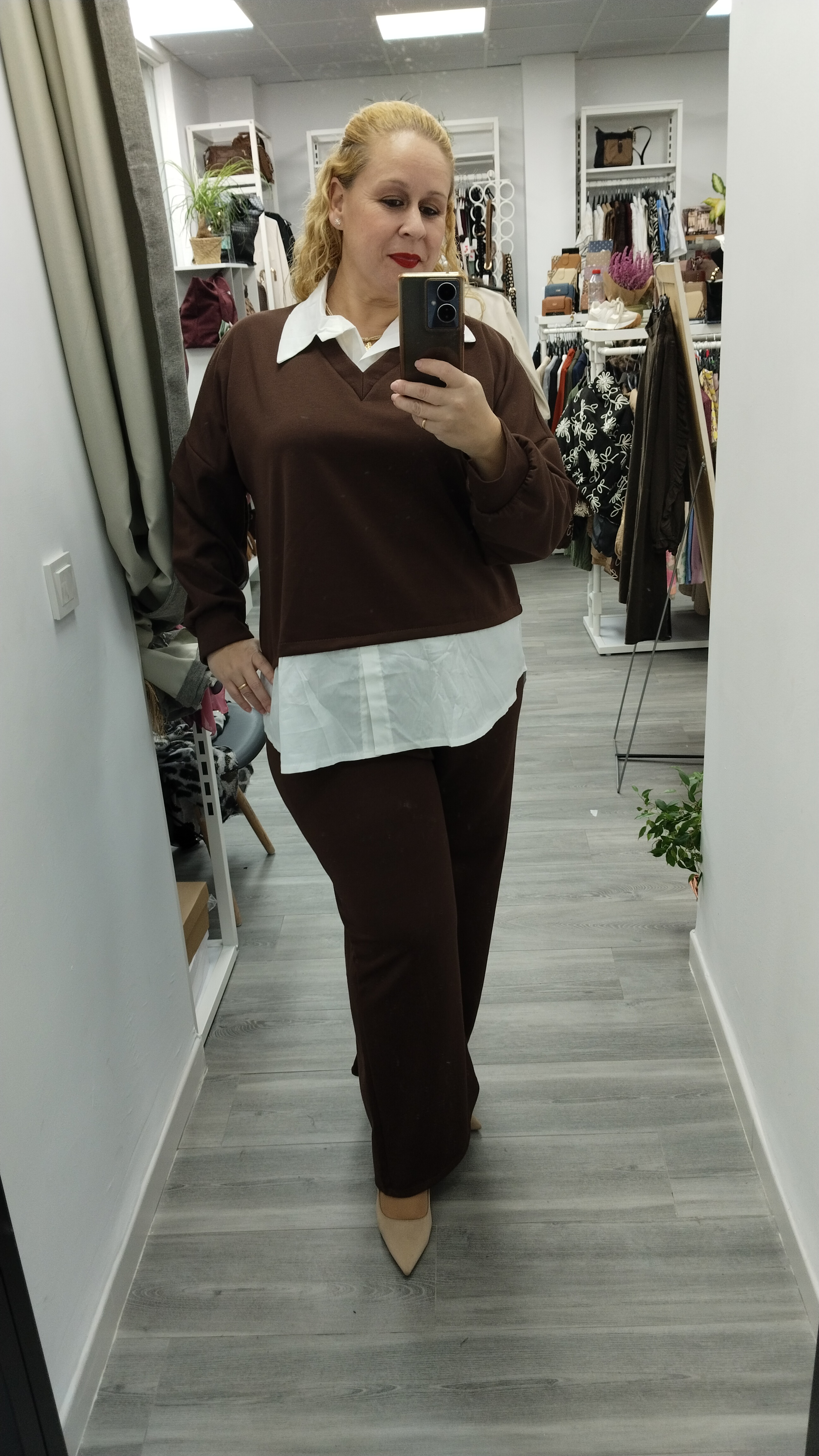 - Chandal de dos piezas, tejido cámara de aire. Sudadera cuello en pico, efecto camisa debajo (Larguita), pantalón recto, cinturilla engomada.