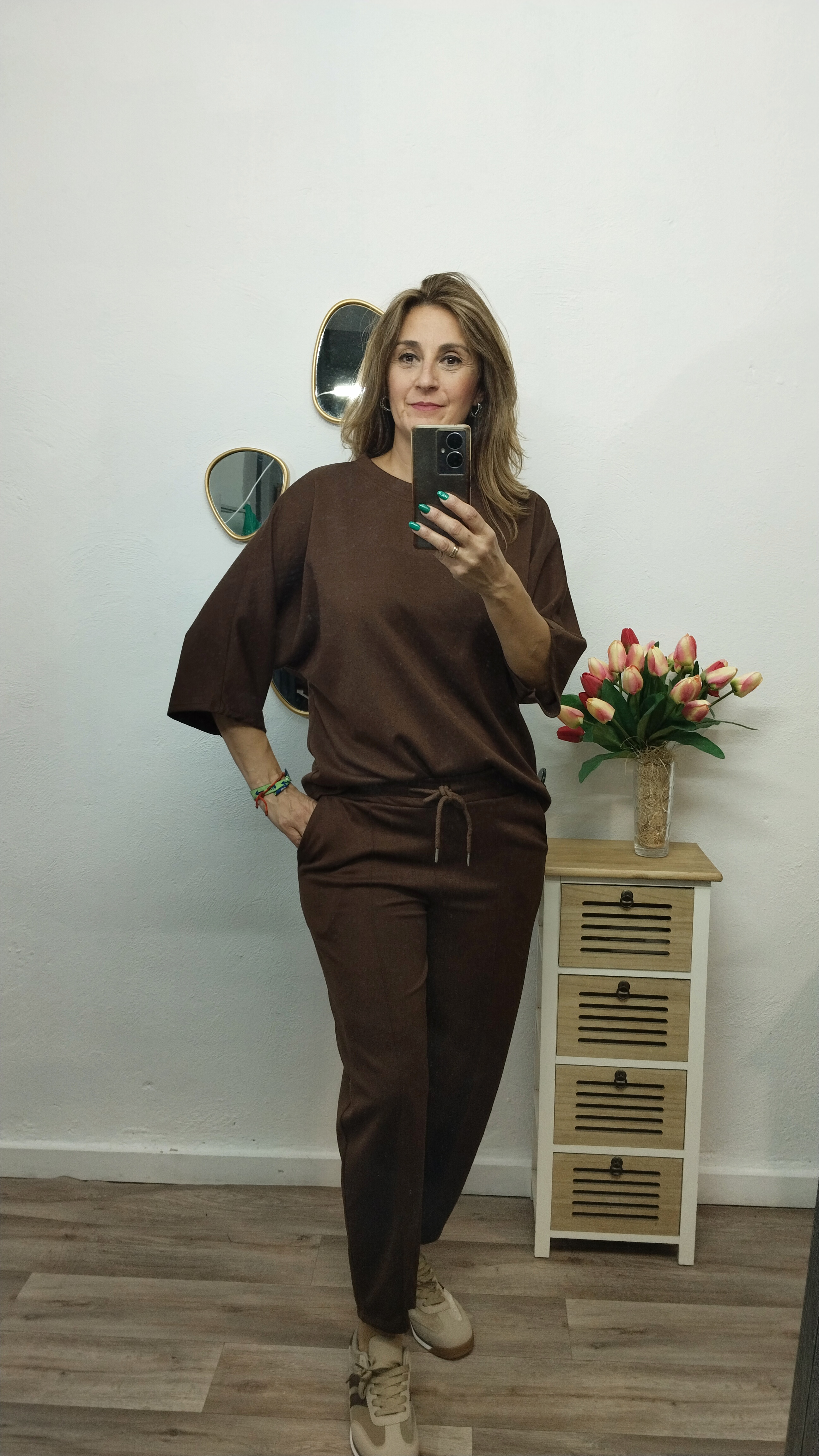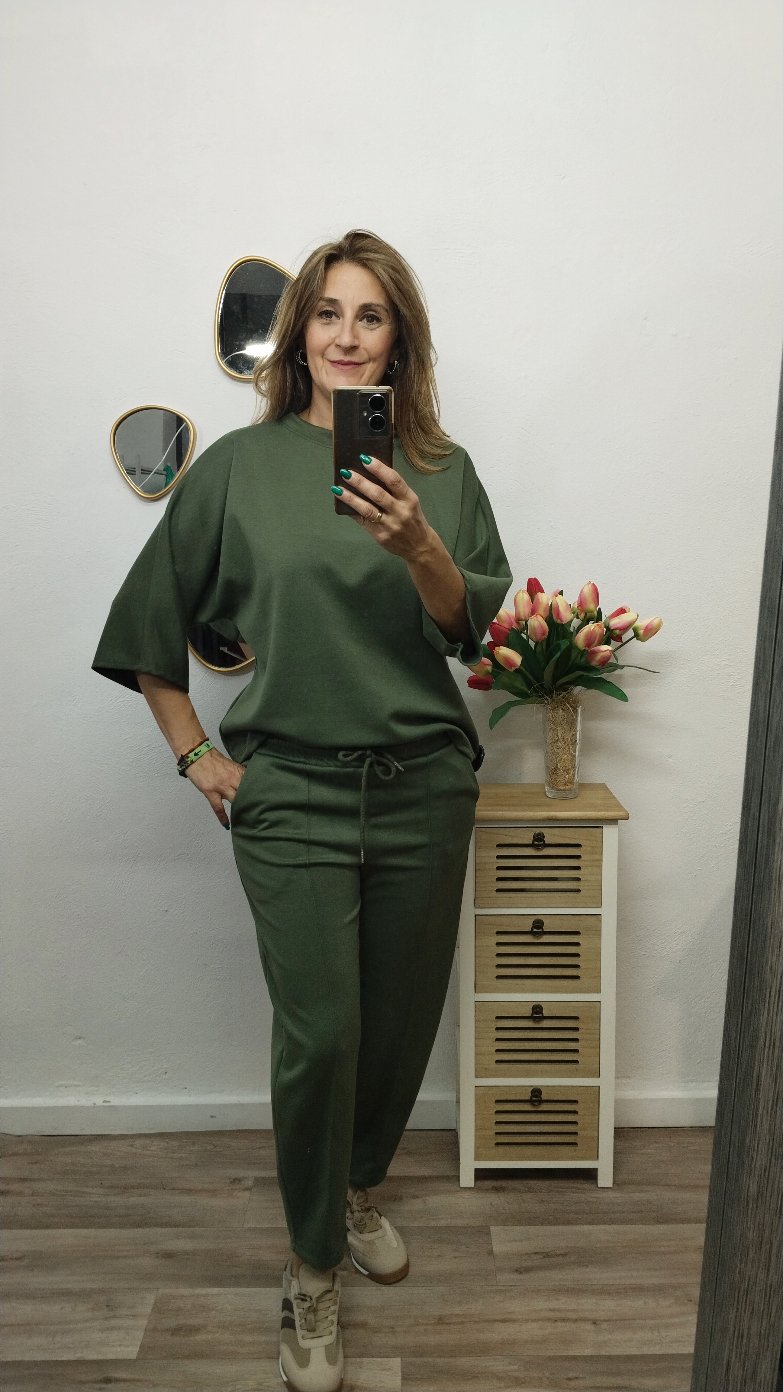 - Conjunto de chandal de dos piezas, tejido cámara de aire, sudadera anchita, con cuello redondo y manga murciélago, francesa. Pantalón forma de globo, con línea de pinza, cintura engomada, con cordón para ajustar, y bolsillos.
