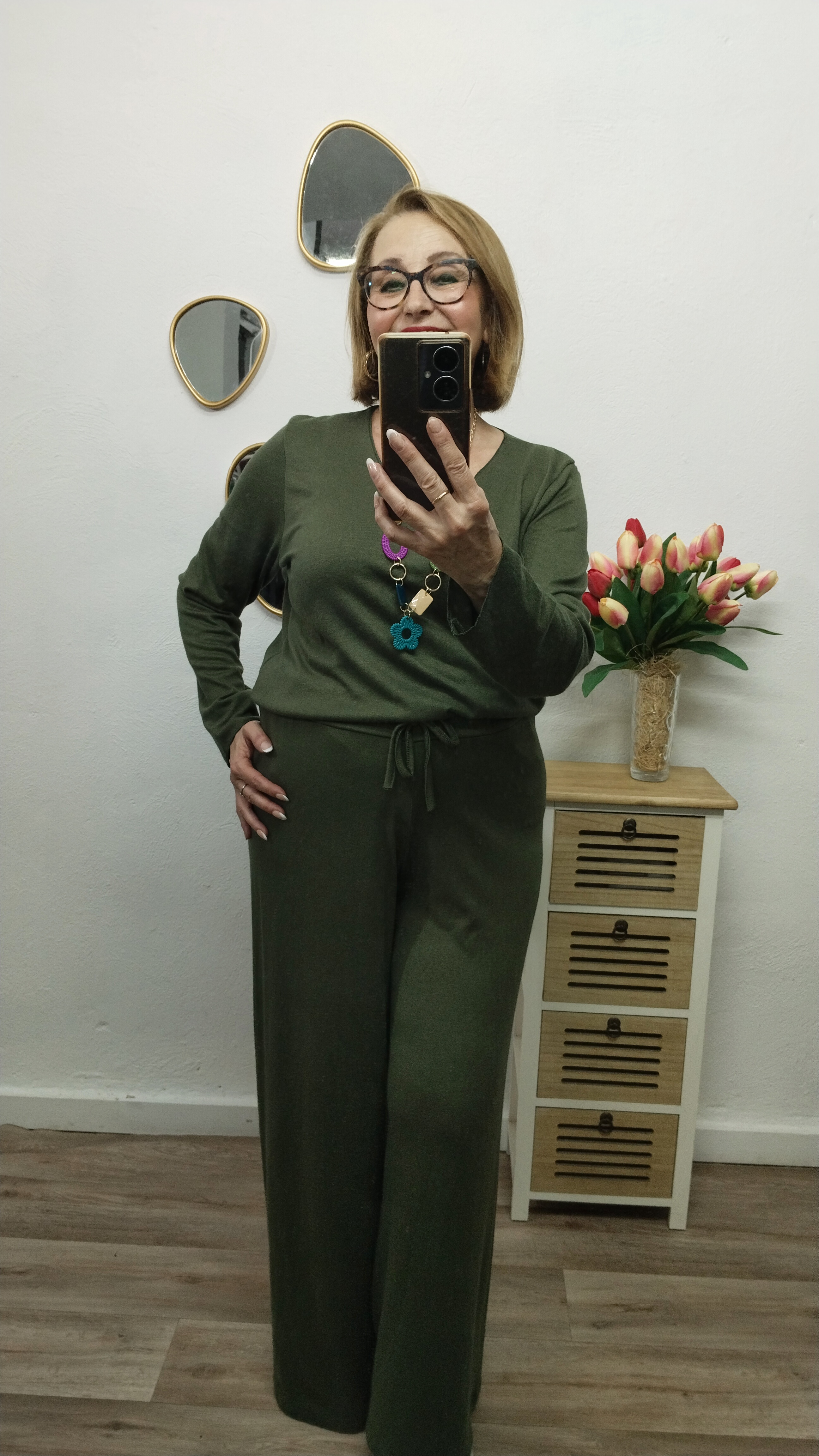 • Conjunto de punto, dos piezas, jersey finito cuello en pico, larguito. Pantalón  recto, anchito, cintura engomada. Lleva collar de regalo.