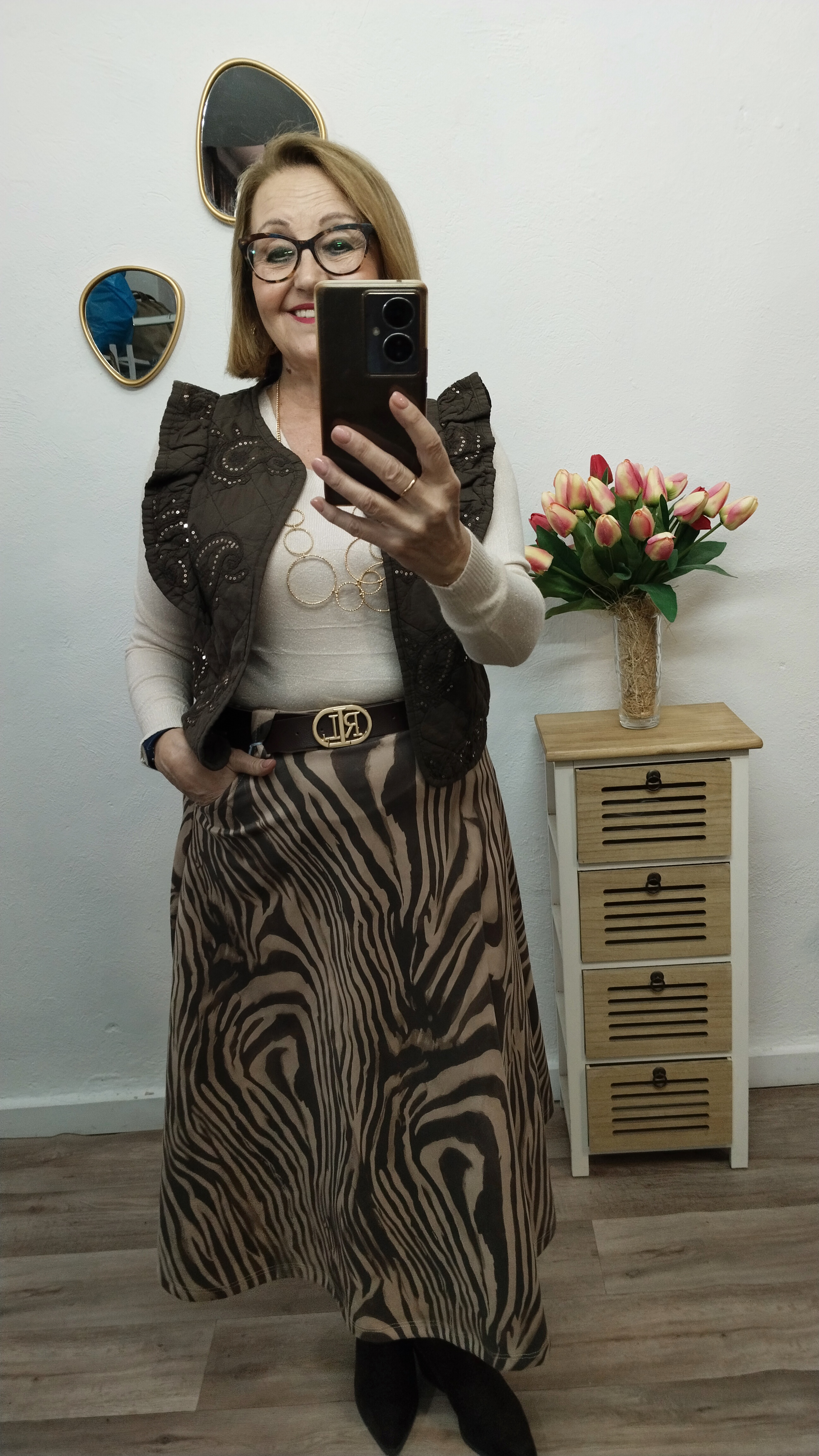 - Falda de antelina, forma evasé, cintura engomada, con cinturon de regalo. Lleva bolsillos. Estampado en cebra o animal print.