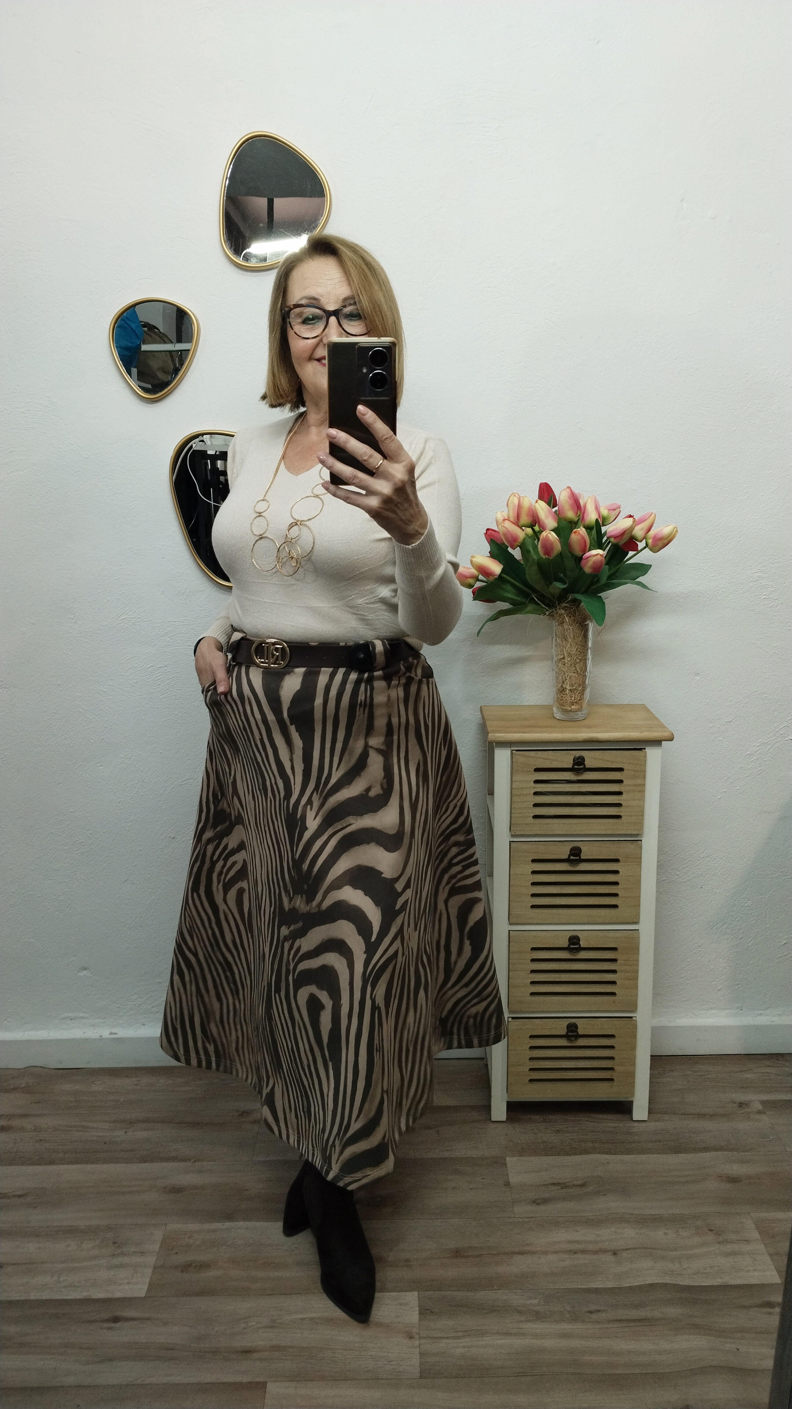 Falda larga de antelina, forma evasé, estampado cebra o animal print.