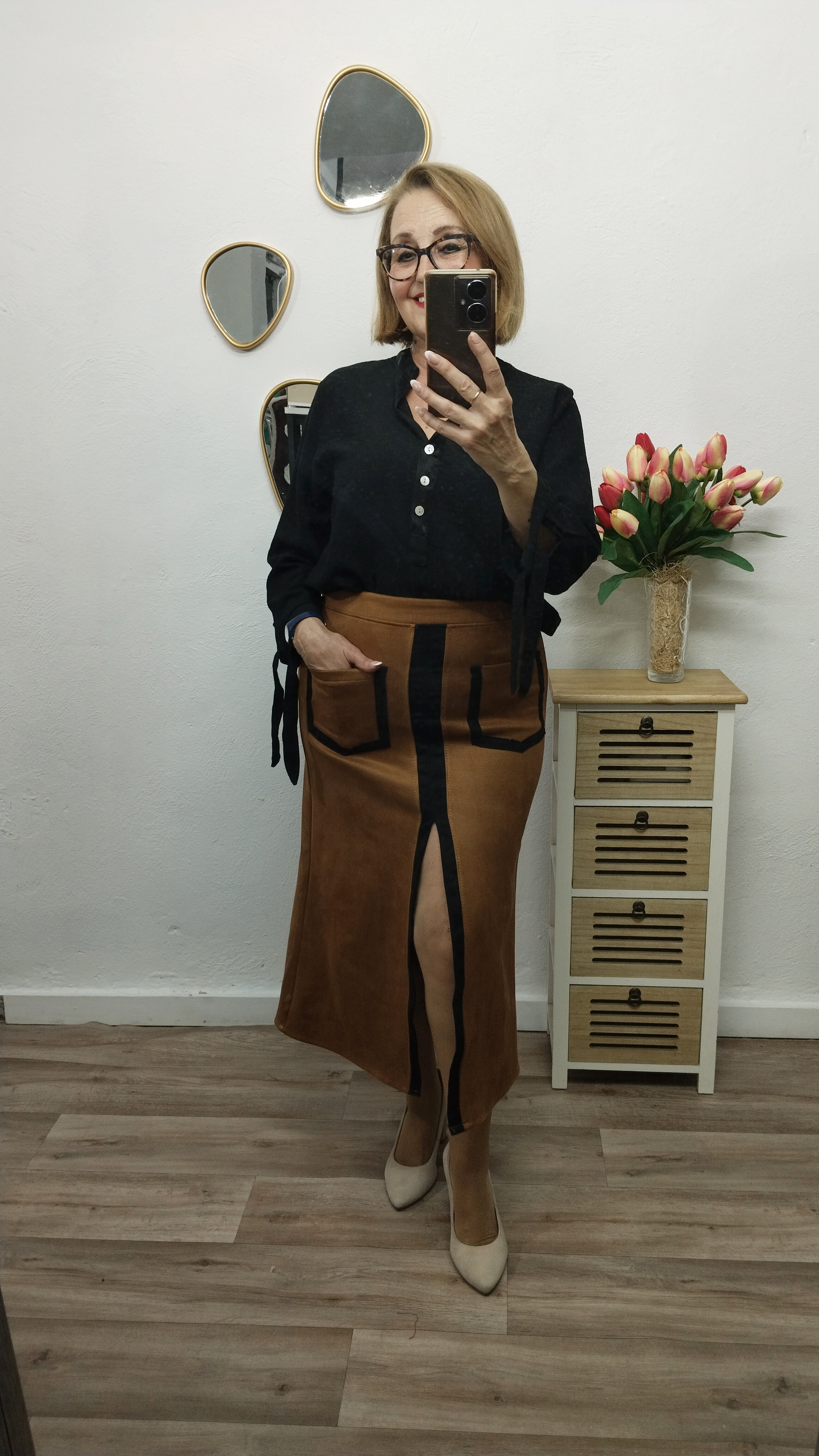 Falda larga de antelina, con rajita en medio, y los ribetes en otro color.