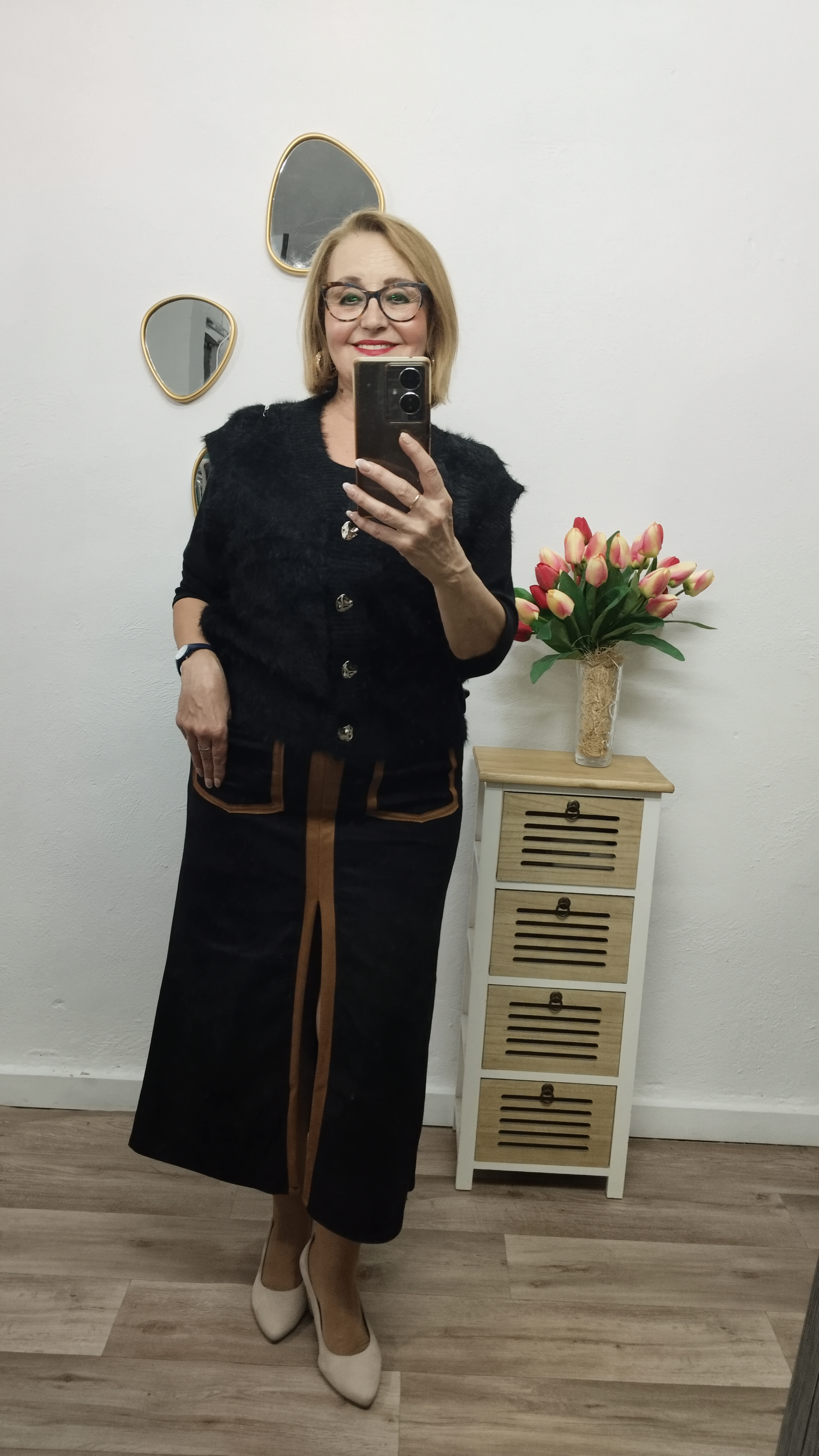 - Falda larga de antelina, con rajita en el medio, dos bolsillos frontales, con ribetes en otro color, cintura engomada.