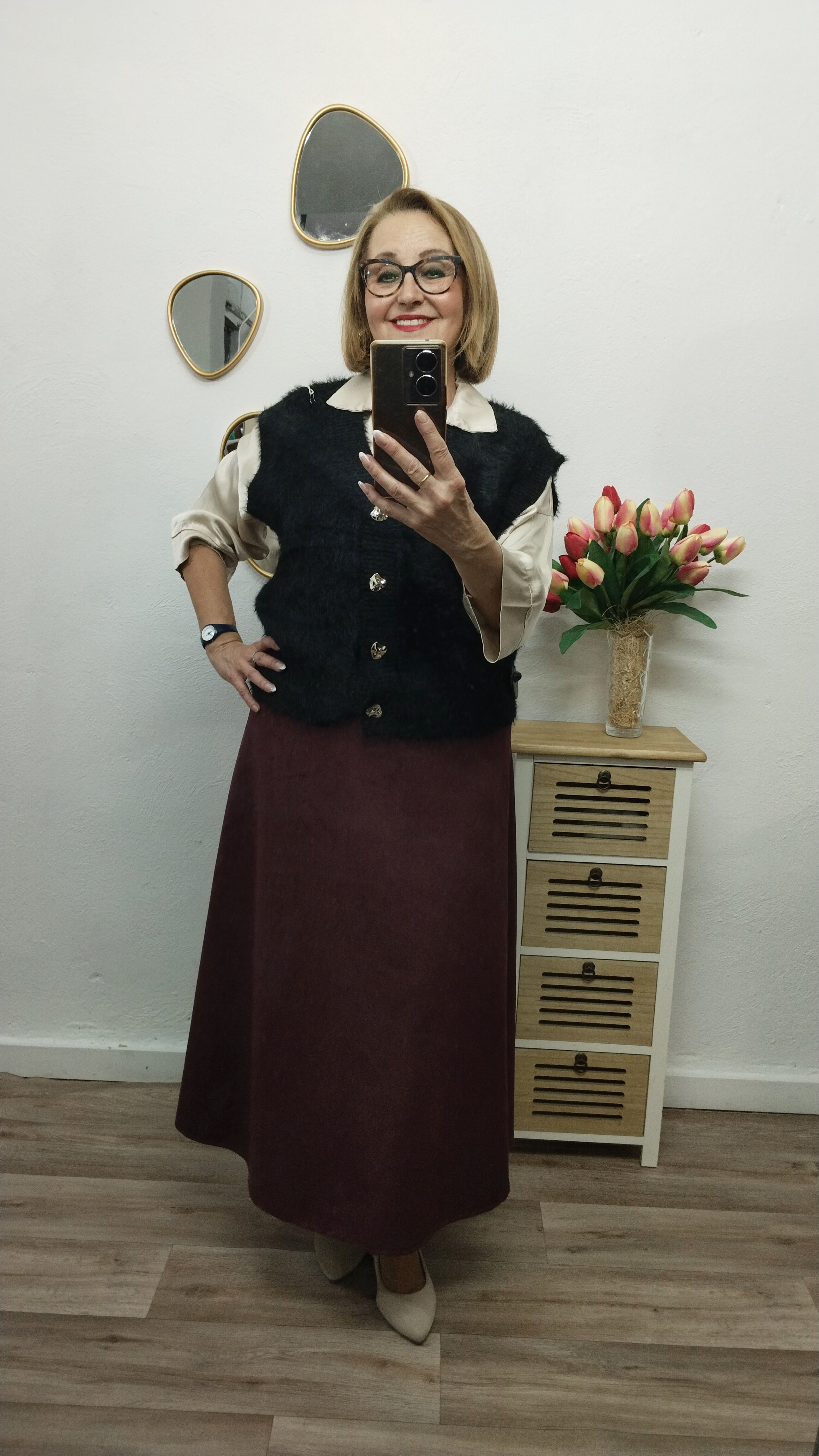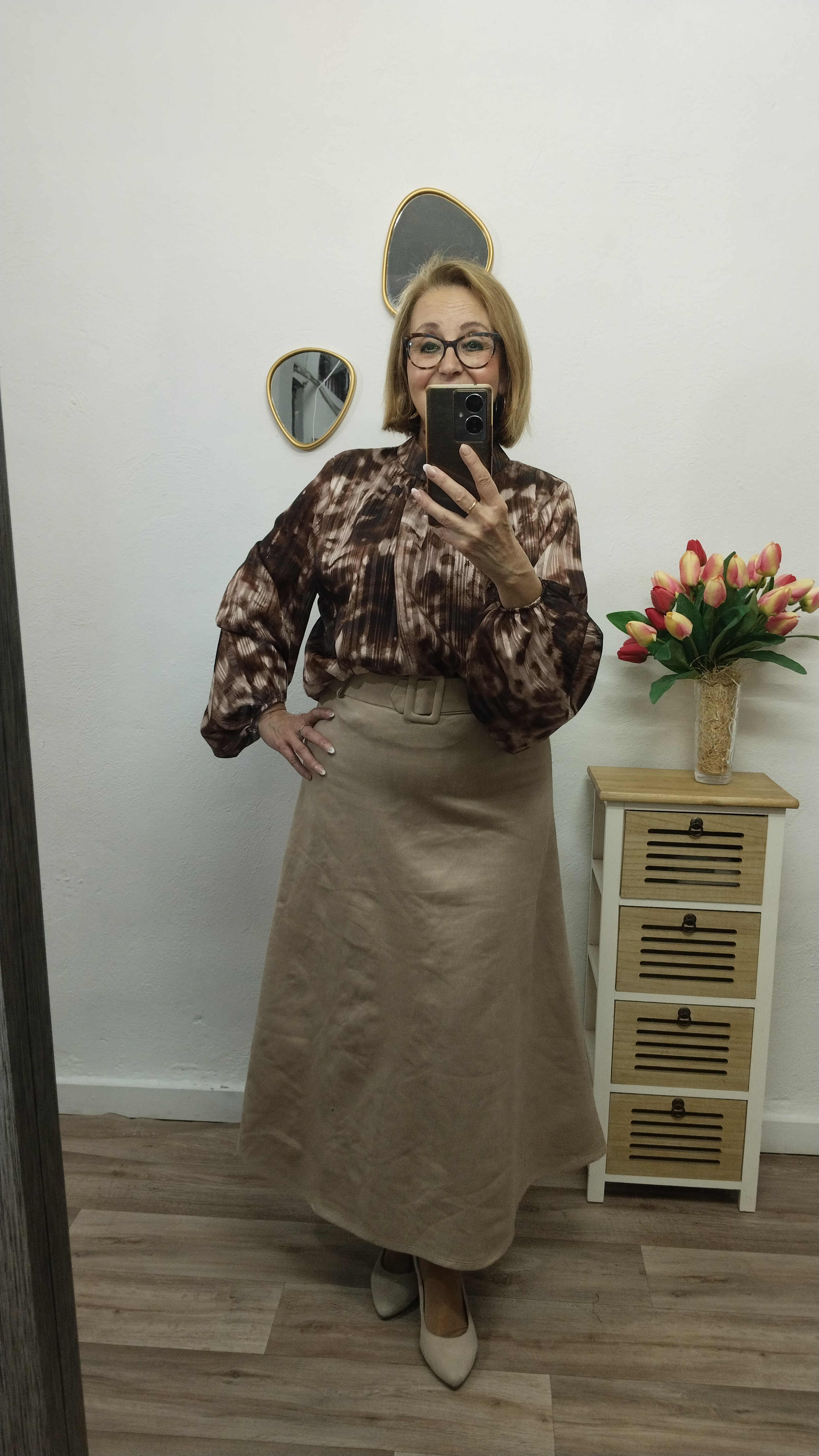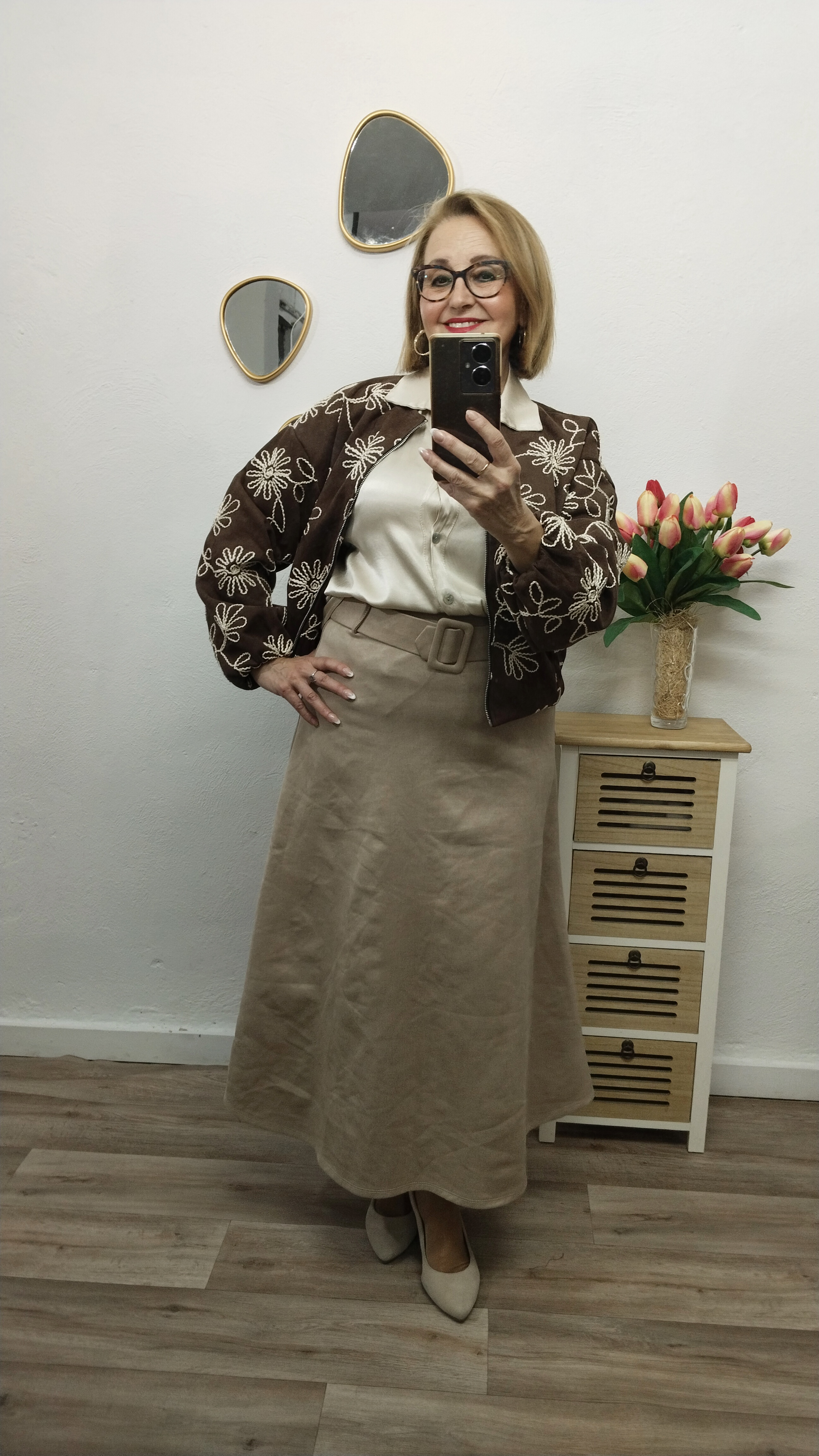 • Falda larga de antelina, forma evasé, cintura engomada, con cinturon a juego.