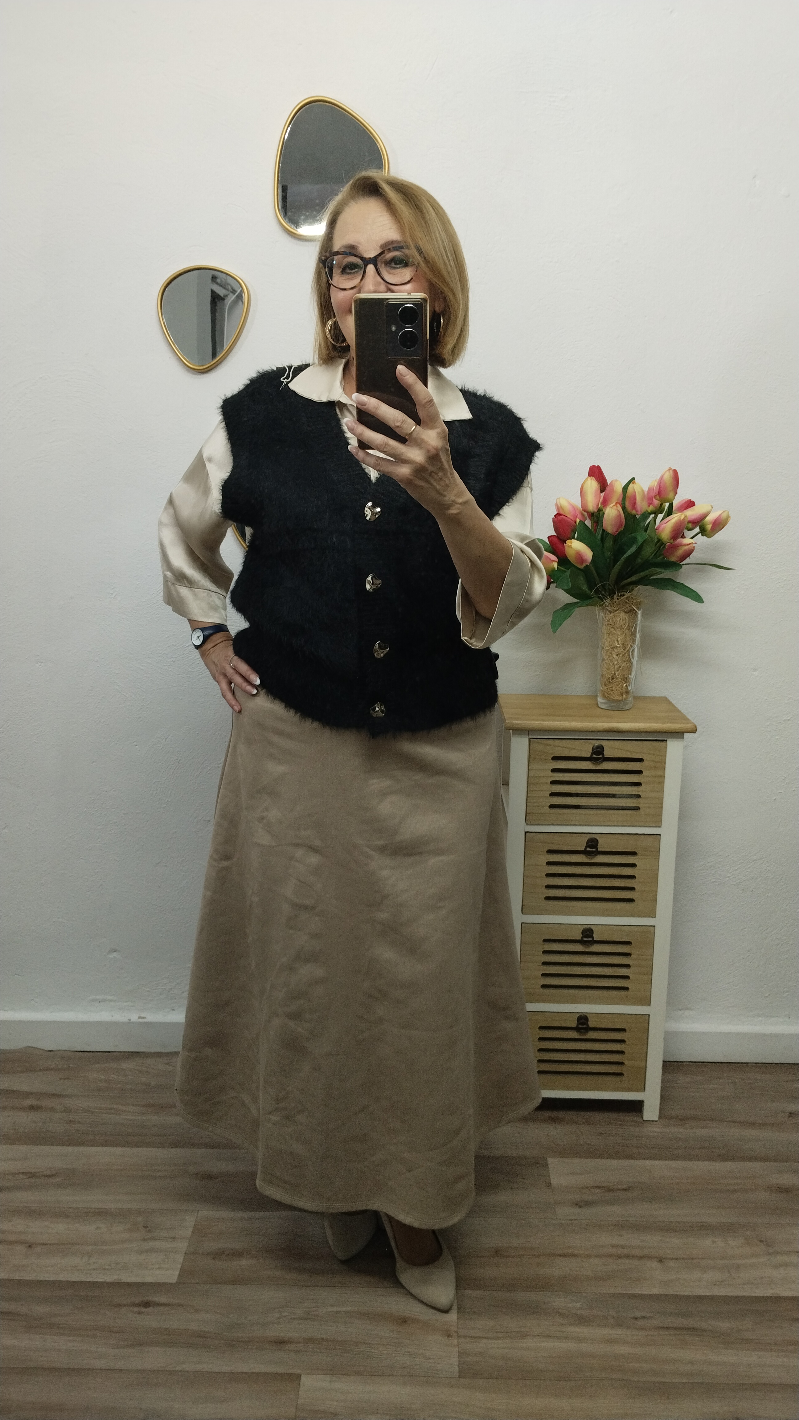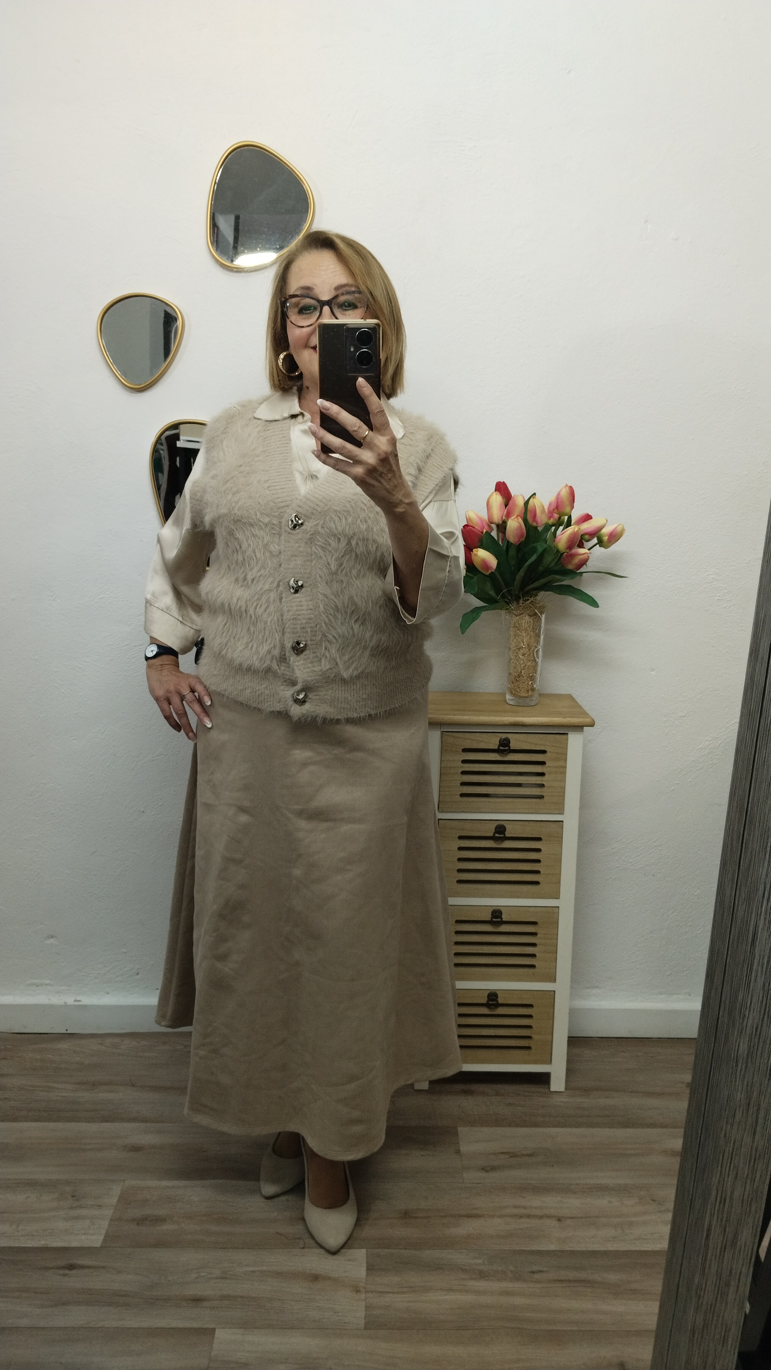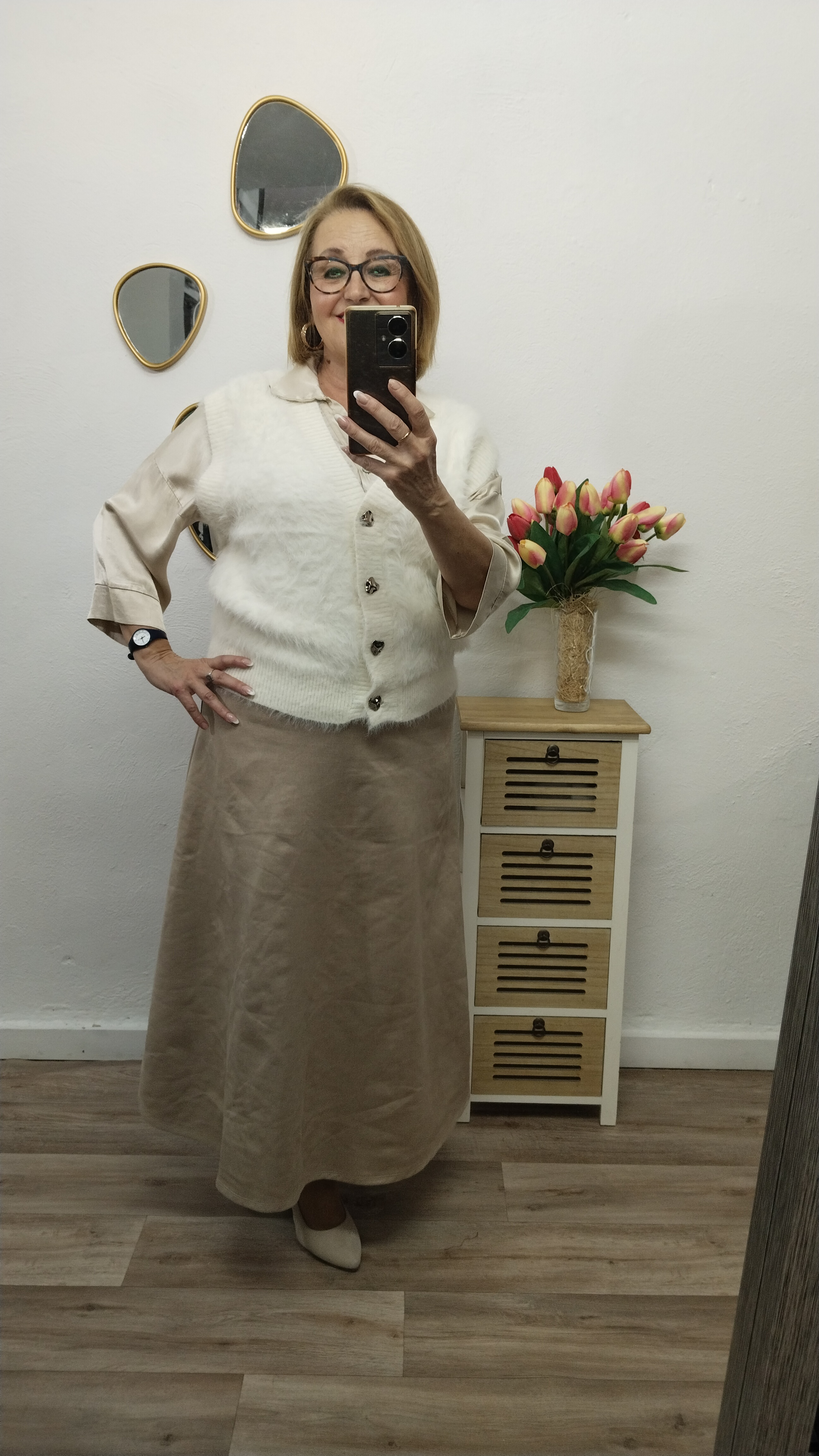 • Falda larga de antelina, forma evasé, cintura engomada, con cinturon a juego.