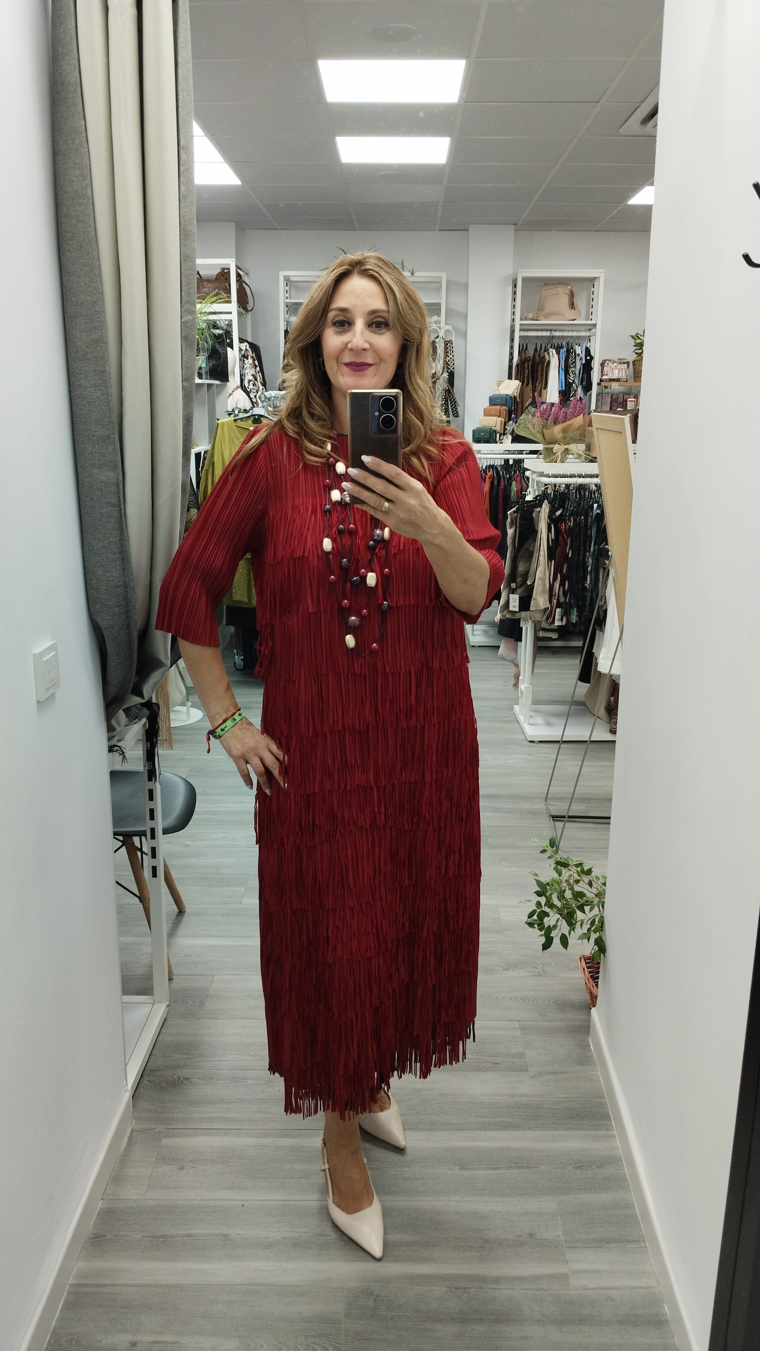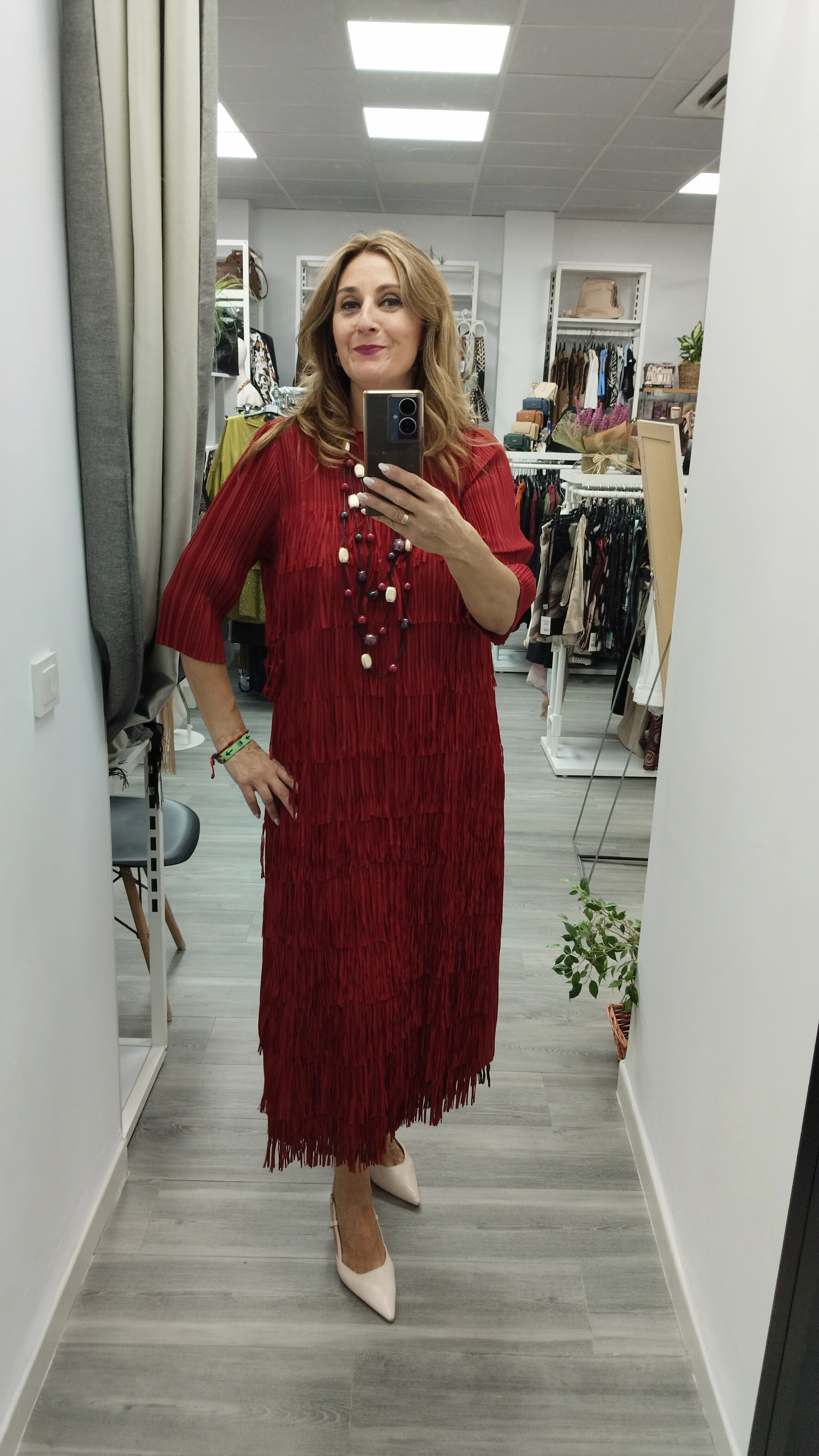 - Vestido de fiesta, todo de flecos, tejido acordeón, elástico, manga francesa. Dá tallita grande.